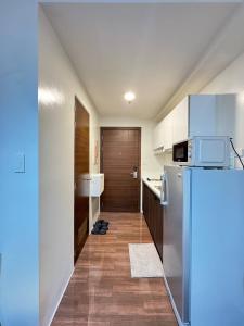 The apartment includes one bedroom, a private bathroom with a shower and bidet, and a living area featuring air conditioning and a fan. Guests can prepare meals in the fully equipped kitchenette which contains a microwave, refrigerator, electric kettle, and washing machine. A TV is provided for entertainment.
