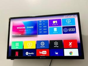 The one-bedroom unit features a bathroom with a shower, towels, and bed linens. Inside the room, guests will find a wardrobe or closet for storage, a table, and entertainment via a flat-screen TV. Soap is supplied in the bathroom to complete the essentials.