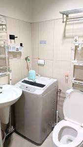 The air-conditioned unit includes one bedroom with heating, a living area featuring a flat-screen TV, and a fully equipped kitchen with an electric kettle. The private bathroom complements the space while access to a washing machine adds convenience.