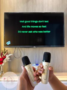 The air-conditioned unit features a living room with a flat-screen TV and dining area alongside a fully equipped kitchen that includes a microwave, refrigerator, kitchenware, and washing machine. The bedroom is complemented by linens and towels provided for guests' use. The bathroom contains free toiletries, a hairdryer, and shower facilities.